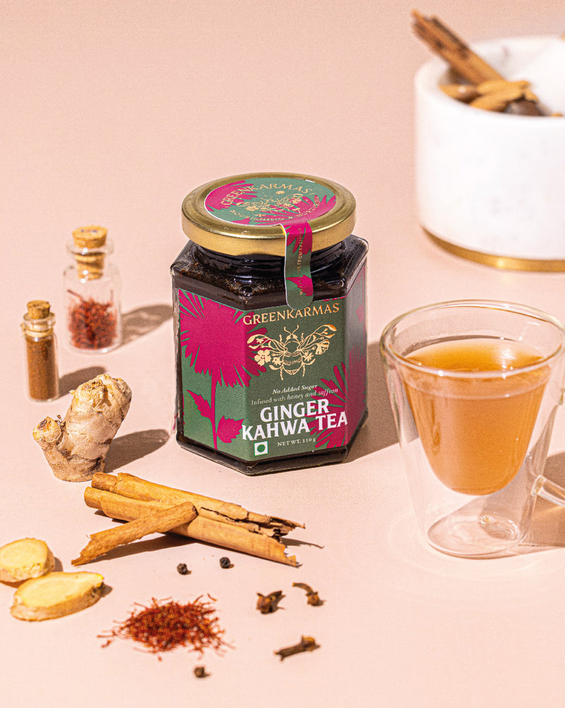 An Ayurvedic blend infused with ginger, saffron, green tea, cinnamon, cardamom, ayurvedic herbs and organic honey. Its warming properties make it ideal for seasonal colds and digestion. Perfect for chilly days or as a comforting drink.